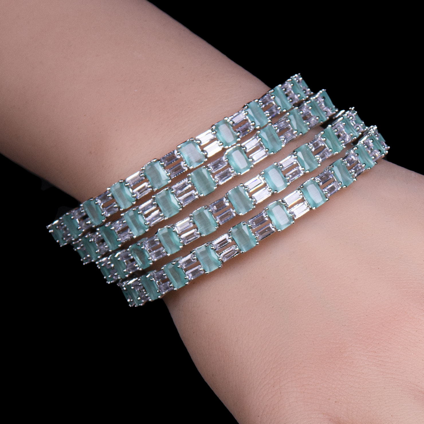 Tags: Four-Piece, Silver-Toned CZ, Mint Green Stone, Geometric Baguette Cut